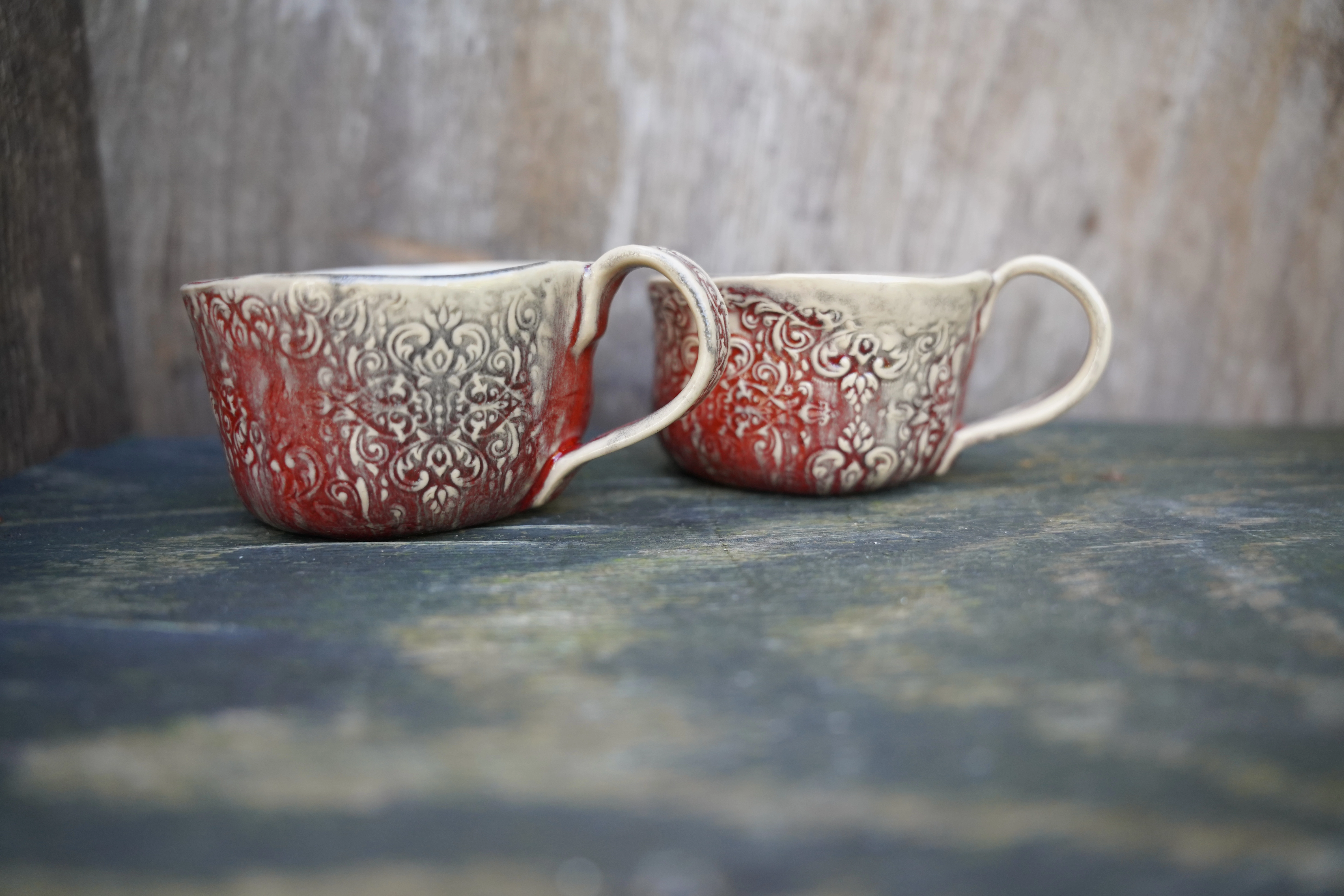 Ręcznie wykonana filiżanka ceramiczna Dessimo w kolorze czerwono-ecru. Unikalne rękodzieło o wyjątkowym charakterze, idealne do kawy, herbaty oraz jako stylowy prezent.