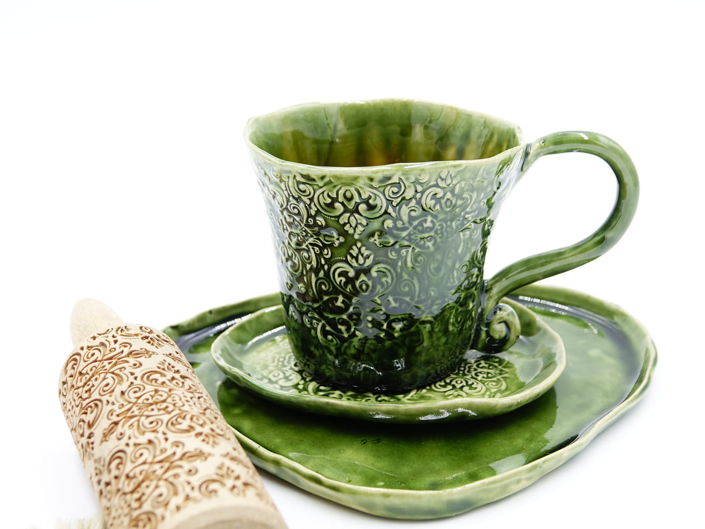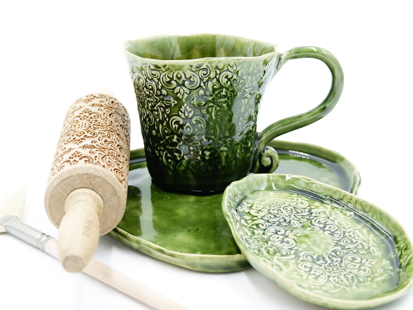 Naczynia użytkowe i dekoracyjne są wykonane w pojedynczym, niepowtarzalnym wzorze.