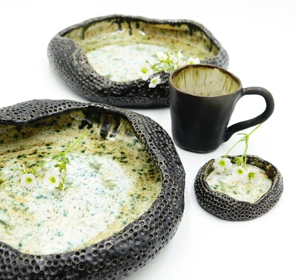 Naczynia użytkowe i dekoracyjne są wykonane w pojedynczym, niepowtarzalnym wzorze.